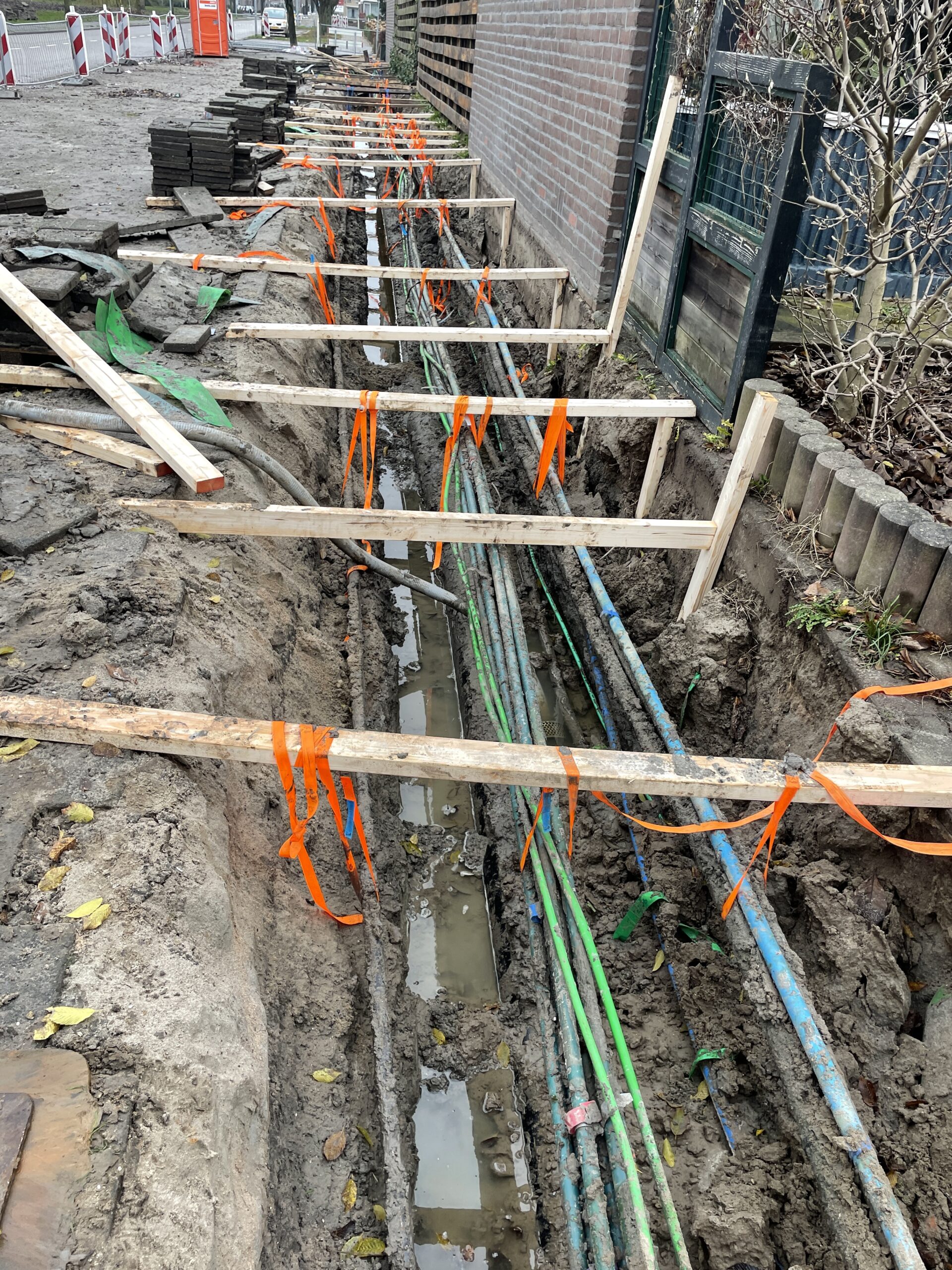 De werkzaamheden begonnen in de Buizerdstraat, waar direct een grote uitdaging aan het licht kwam: boven ons tracé lag een compleet pakket glasvezel‑mantelbuizen, precies op de plek waar de nieuwe leidingen moesten komen.